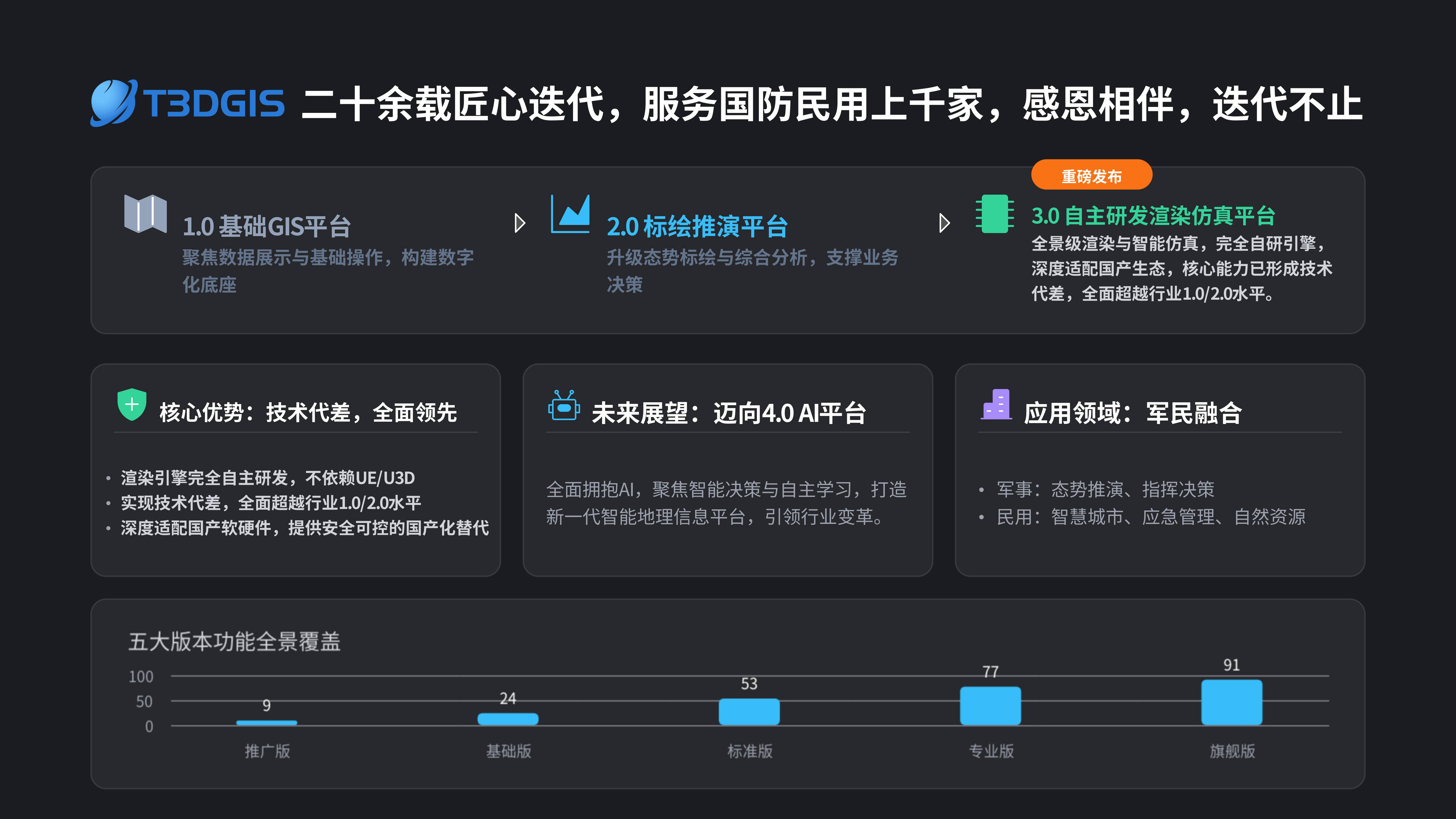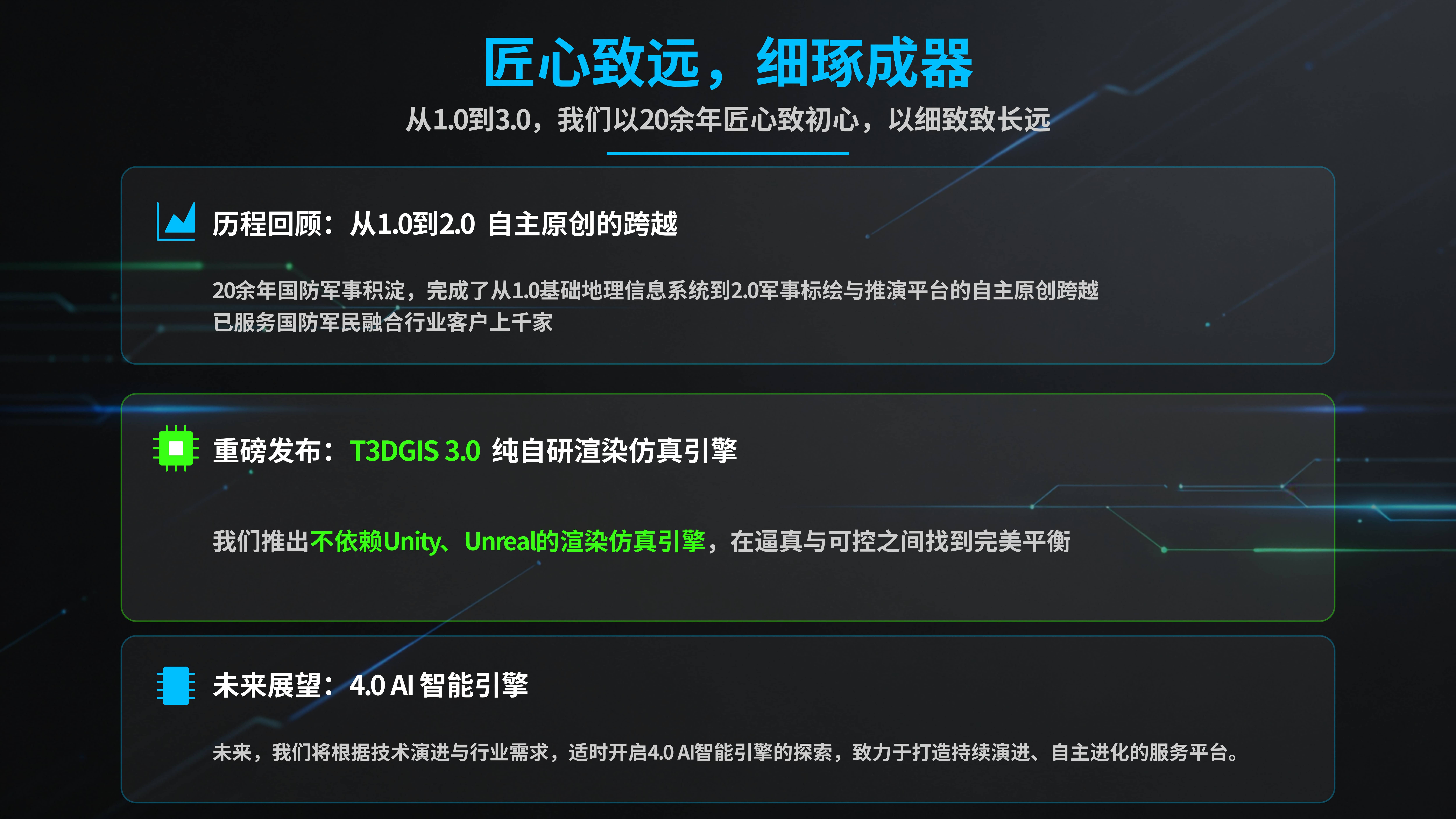 成都趋势电子有限责任公司(微信公众号M3DGIS)自2001年成立至今坚持全自主源代码开发,打造T3DGIS&M3DGIS国产银河麒麟二三维数字沙盘大数据可视化研训推演系统!公司深耕国防军事信息化 20 余年,专注军用国产地理信息系统、态势标绘、模拟推演平台研发。上百项军民功能深度耦合赋能・信创模块化按需选配定制。深度适配飞腾 / 龙芯计算机及国产操作系统,立志成为关键领域 “信创人桥”!产品已规模化应用于军委联指、陆海空火箭军及战略支援部队等,覆盖武警、公安、应急、智慧园区、能源安监等多领域场景,在国防军工及民用信创领域累计部署超千套核心系统!获评国家高新技术企业、四川省专精特新企业等,CST、CCMA、CNAS、ILAC MRA 等百余份权威认证。针对武警、部队、公安、消防、应急等行业实战需求,通过手势触摸、鼠标及 VR/MR 交互终端,融合 AI人工智能 与虚拟现实技术,在统一框架内集成全要素三维地理信息(含骨骼动画引擎、全球高清卫星影像集、矢量电子地图库、1 秒级 DEM 高程、高精度无人机倾斜摄影数据及 3DMAX/BIM 轻量化构件库等),为指挥决策提供应急场景构建、战场态势解算、作战决心生成的全流程支撑,实现实战化便携部署与实时响应,达成实案推演、实战应用的训练目标。始终践行 “凡事有闭环、件件可追溯、事事见成效” 的服务标准。